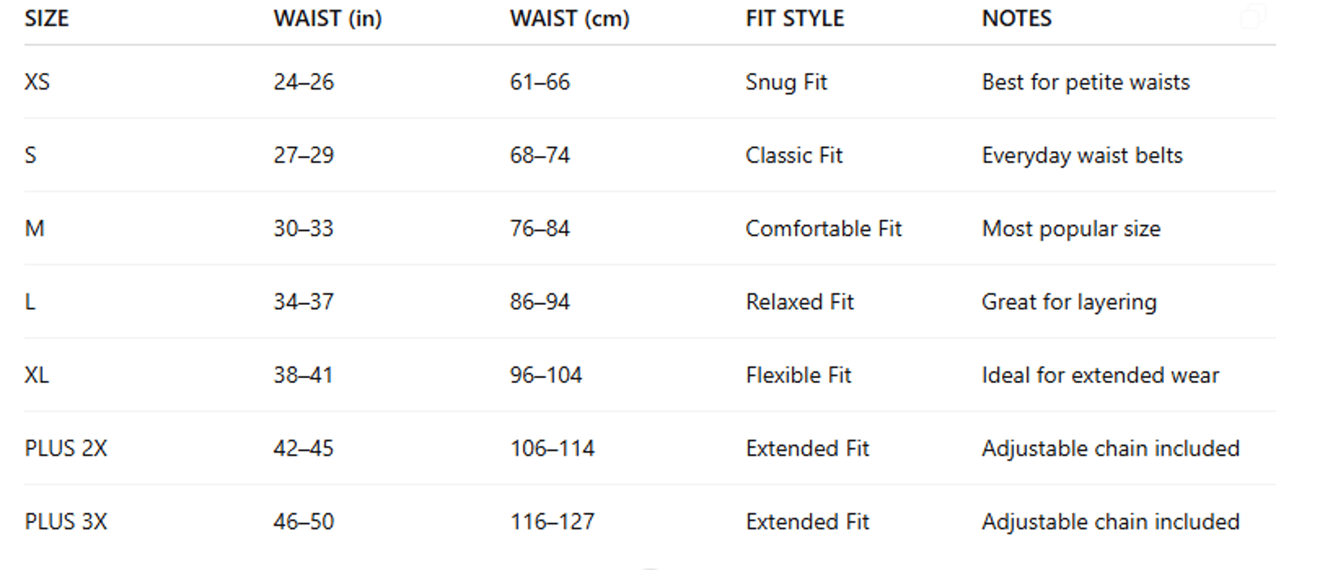 Measurements are approximate. For body chains, size up for a relaxed fit. All belts come with extra holes or an adjustable chain